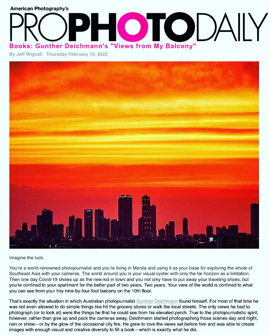 ![]() ![]() I have no idea how large or small Gunther Deichmann’s apartment in Manila is, but the images from his new book — “Views from my Balcony” — are spectacular vignettes of life, flashing with light and color. Filled with images of rickshaws flitting in the night, people running in the rain, storms brooding along and above the skyline, buildings on fire, and life exploding onto the streets of a magical place he has plucked from the shadows, we see life through the eyes of a master looking down from on high at a vibrant city. What an extraordinary testament to how a gifted photographer can be boxed onto a sliver of concrete ten floors about the ground, and yet see and create an entire world. If there is one place Jay Maisel might have traded for his legendary building on New York City’s Bowery, it might be Gunther Deichmann’s balcony in Manila. Highly recommended. | ||
